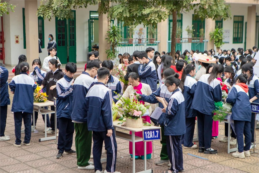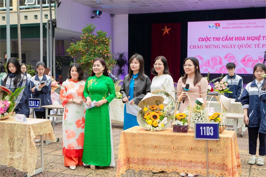 Mở đầu chuỗi sự kiện là cuộc thi cắm hoa nghệ thuật do Đoàn trường tổ chức dành cho các lớp học sinh. Với sự sáng tạo và khéo léo, các đội thi đã mang đến những tác phẩm đầy màu sắc và ý nghĩa, thể hiện sự tri ân sâu sắc đối với phái đẹp. Những lẵng hoa không chỉ được sắp đặt tinh tế mà còn chứa đựng những thông điệp ý nghĩa về tình yêu, sự tôn trọng và lòng biết ơn gửi đến các bà, các mẹ và cô giáo. Ban giám khảo đã gặp không ít khó khăn trong việc chọn ra những tác phẩm xuất sắc nhất, bởi mỗi bài dự thi đều mang dấu ấn riêng biệt, sáng tạo.