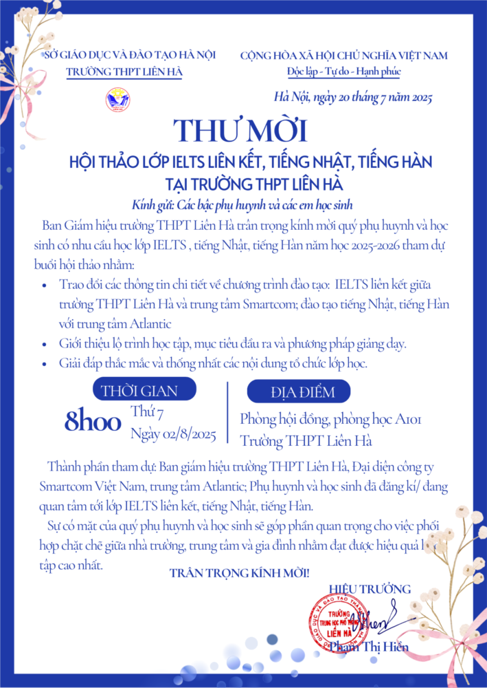 Nhằm cung cấp thông tin chi tiết đến quý phụ huynh và học sinh về chương trình ngoại ngữ tăng cường trong năm học mới, Trường THPT Liên Hà tổ chức Hội thảo lớp IELTS liên kết, tiếng Nhật, tiếng Hàn vào sáng thứ Bảy, ngày 02/8/2025 tại phòng Hội đồng và phòng học A101 của nhà trường.