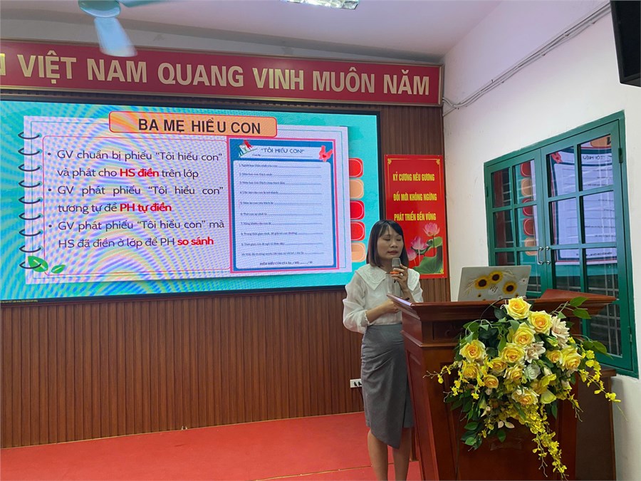 Trong chương trình, các tham luận được trình bày phong phú, thiết thực và giàu ý nghĩa: cô Nguyễn Thị Thu Hồng tập trung chia sẻ kinh nghiệm khai thác các mối quan hệ trong quá trình chủ nhiệm để gắn kết phụ huynh, giáo viên bộ môn và các bộ phận trong nhà trường nhằm nâng cao hiệu quả giáo dục học sinh; cô Nguyễn Phương Thúy giới thiệu những ứng dụng phần mềm, công cụ số và trí tuệ nhân tạo trong quản lý lớp học, giúp tối ưu hóa hiệu quả công tác chủ nhiệm trong bối cảnh chuyển đổi số; cô Đinh Võ Thùy Dương nhấn mạnh việc nâng cao nhận thức và kỹ năng cho học sinh trong tương tác lành mạnh, sáng tạo trên môi trường mạng, góp phần xây dựng văn hóa ứng xử học đường an toàn; cô Phùng Anh Thu Trang trình bày tham luận về vai trò của giáo dục cảm xúc trong công tác chủ nhiệm, coi đây là yếu tố then chốt để hình thành nhân cách và tạo động lực học tập cho học sinh.