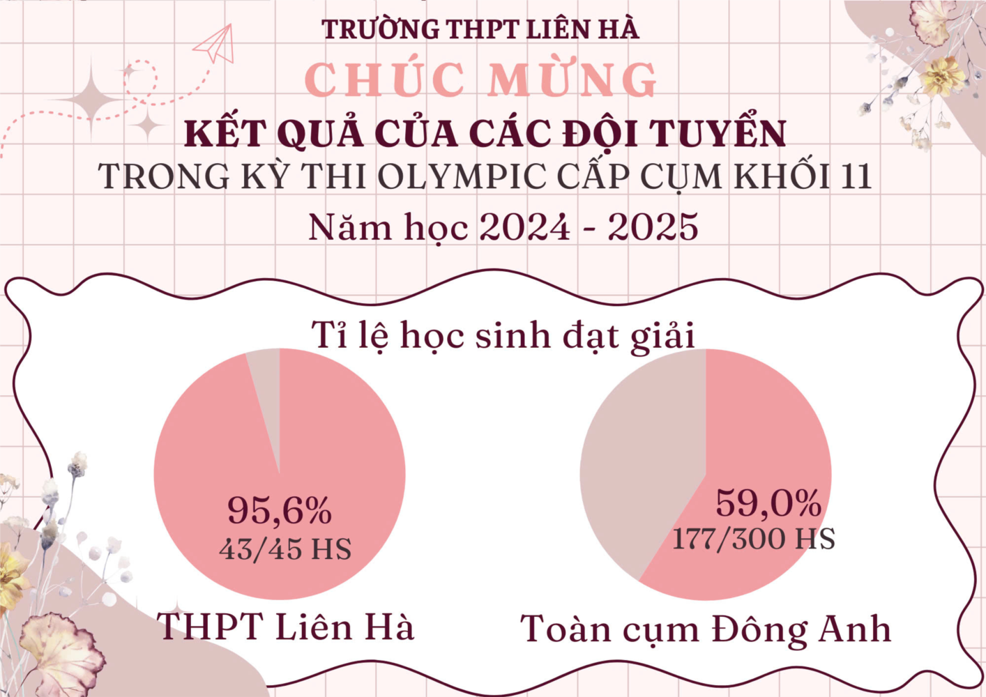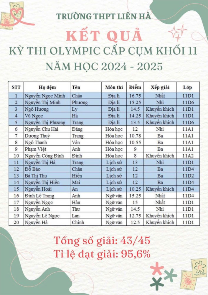 Kỳ thi Học sinh giỏi Olympic cấp cụm khối 11 năm học 2024-2025 đã diễn ra sôi nổi với sự tham gia của các đội tuyển đến từ nhiều trường THPT trong khu vực. Trường THPT Liên Hà tự hào khi đạt được những thành tích xuất sắc, khẳng định chất lượng giảng dạy và tinh thần hiếu học của học sinh nhà trường.