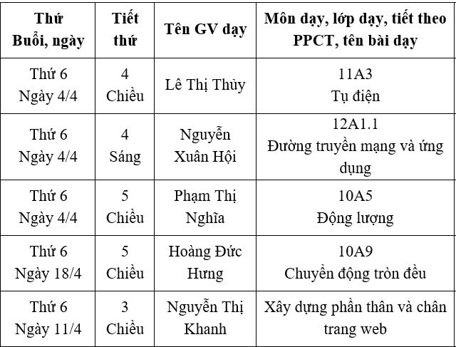 Nằm trong kế hoạch dự giờ hàng tháng nhằm nâng cao chất lượng dạy học và trao đổi, học tập phương pháp của các thành viên trong tổ. Tháng 4, Tổ Lý - Tin - Công nghệ đã tiến hành dự giờ các đồng chí