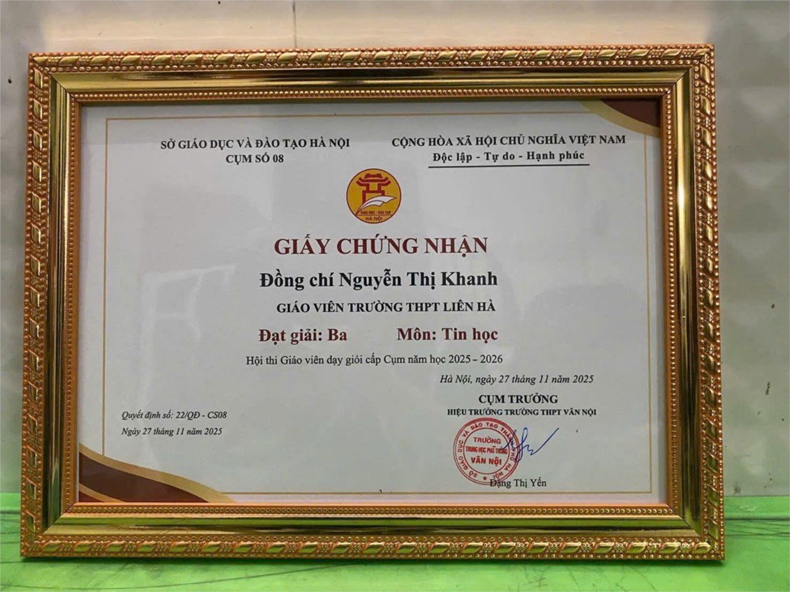 🎉 Tổ Toán – Tin, Trường THPT Liên Hà xin chúc mừng cô Nguyễn Thị Khanh, giáo viên môn Tin học, đã đạt giải Ba trong Hội thi Giáo viên dạy giỏi cấp Cụm năm học 2025–2026.
