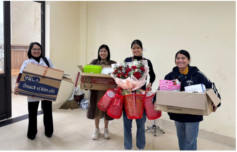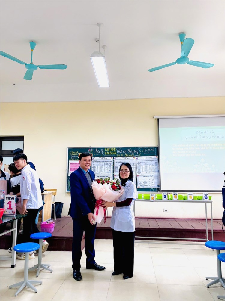 Kết thúc tiết dạy, thầy Trịnh Danh Hùng – đại diện BCH Công đoàn và nhà trường tặng hoa chúc mừng cô và trò.