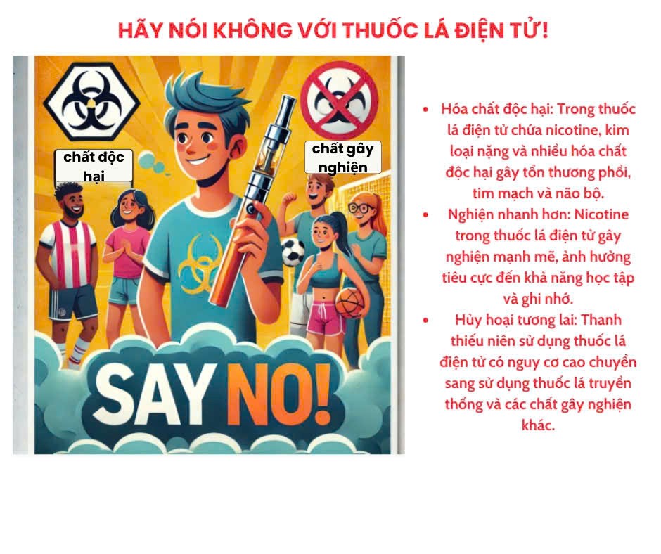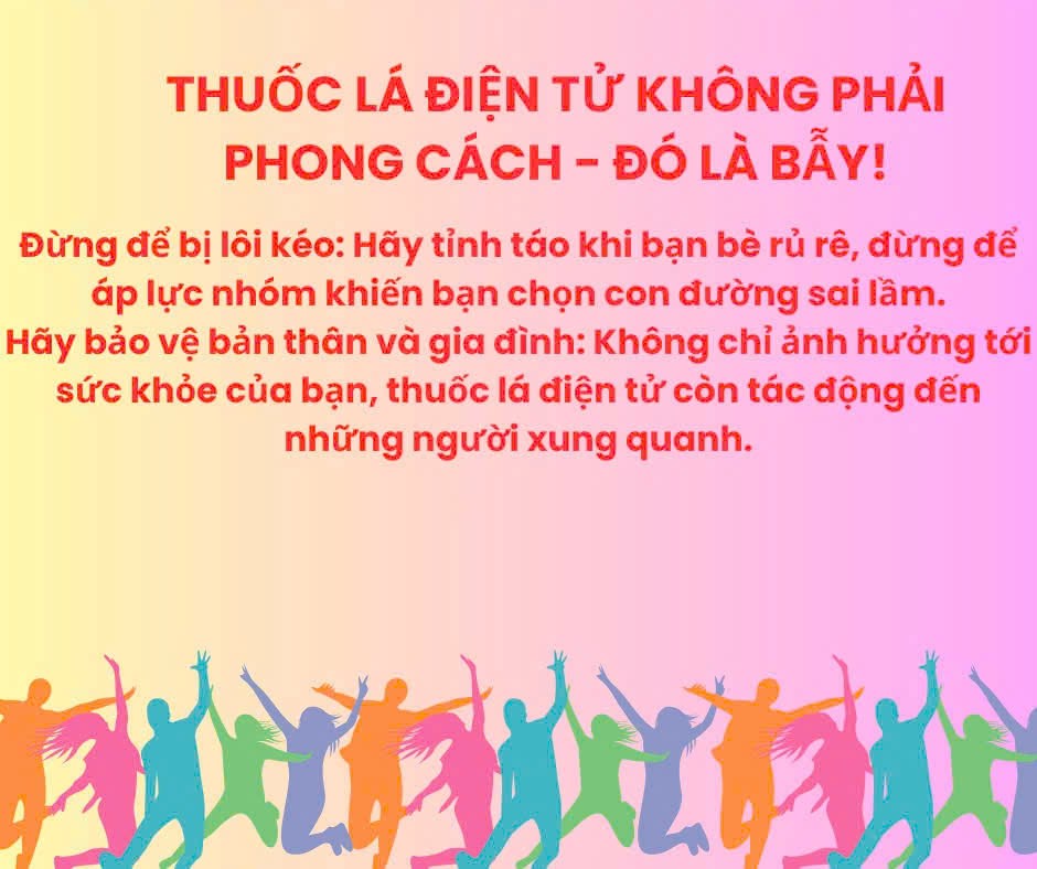 Thực hiện QĐ 3900/BGD lồng ghép phòng chống tác hại của thuốc lá trong chương trình môn học, trường THPT Liên Hà thực hiện đồng bộ nhiều giải pháp, trong đó có việc tuyên truyền bằng nhiều hình thức để nâng cao nhận thức, ngăn ngừa sử dụng các sản phẩm thuốc lá, bao gồm thuốc lá thế hệ mới, xây dựng môi trường không khói thuốc – học sinh Liên Hà “Nói không với thuốc lá điện tử”
