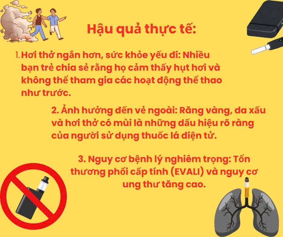 Hiện nay, ở Việt Nam, tỷ lệ sử dụng thuốc lá điện tử trong giới trẻ đang gia tăng nhanh chóng. Kết quả điều tra năm 2022 cho thấy, tỷ lệ học sinh sử dụng thuốc lá điện tử ở lứa tuổi 13 – 15 gia tăng đáng kể, từ 2,6% năm 2019 lên 3,5% năm 2022. Vì suy nghĩ thiên lệch các bạn trẻ cho rằng hút thuốc lá là cách thức khẳng định sự chín chắn, trưởng thành và thể hiện được cá tính của bản thân, nhưng cũng có bạn vì đua đòi và học theo bạn bè, vì tò mò và cũng có bạn tìm đến thuốc lá như một biện pháp giảm bớt căng thẳng, hút dần thành quen và dẫn đến nghiện.