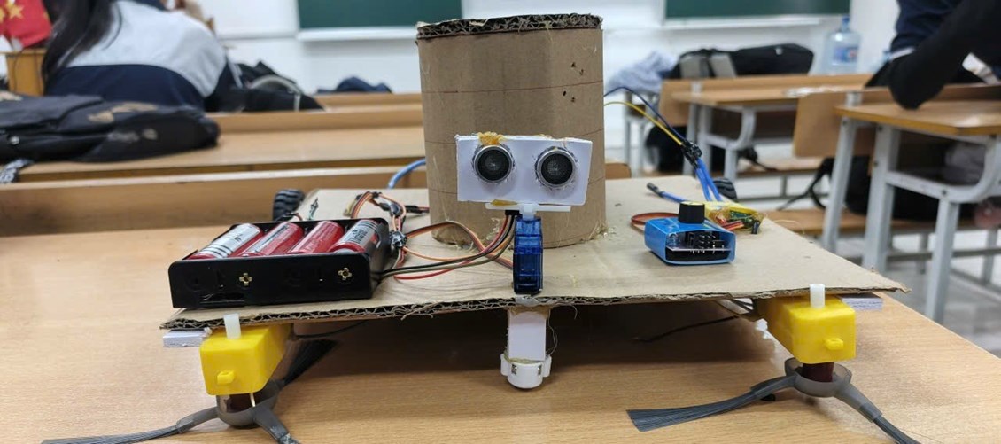 Mô hình Robot Vacuum Cleaner – sản phẩm STEM gắn với nội dung bài học tiếng Anh và ứng dụng công nghệ.