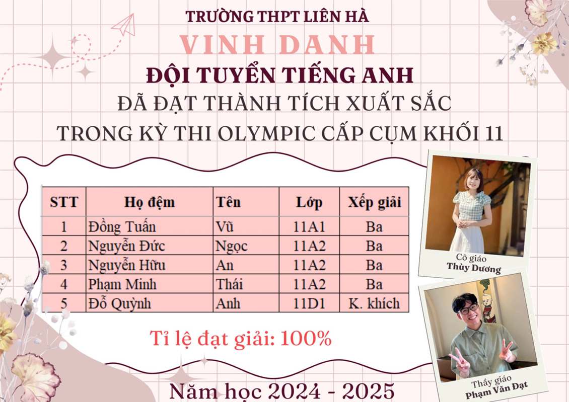 Tiếp nối những hoạt động chào mừng Tháng Thanh niên, trong Kỳ thi Olympic 11 - Cụm các trường THPT Đông Anh, thầy trò Ngoại Ngữ đã xuất sắc đạt được: 4 giải Ba, 1 giải khuyến khích: