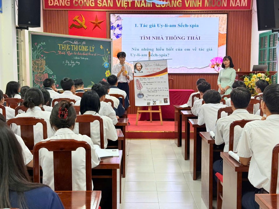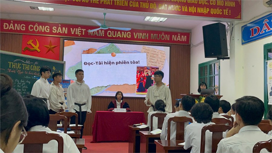 Trong buổi sinh hoạt chuyên đề, các đồng chí đại diện trong BGH và toàn thể giáo viên Ngữ văn cụm trường THPT Đông Anh tham gia dự giờ tiết học môn Ngữ văn do cô Phạm Thị Thu Vân - giáo viên tổ Ngữ văn trường THPT Liên Hà giảng dạy. Có thể nói, nhờ việc vận dụng linh hoạt, hợp lý các hình thức tổ chức hoạt động dạy học, các phương pháp dạy học đổi mới, tiết dạy “Thực thi công lý” (Tiết 1 - chương trình Ngữ văn 12 sách Cánh diều) của cô Phạm Thị Thu Vân đã đem đến tiết học sinh động, vui vẻ; khơi gợi được tính chủ động, sáng tạo; tạo sự phấn khích, say mê, hứng thú với môn Ngữ văn của học sinh. Các em học sinh hăng hái tiếp thu kiến thức, phối kết hợp nhịp nhàng trong các bước thực hiện hoạt động học. Tiết học đã để lại nhiều ấn tượng tốt đẹp đối với các thầy cô tham gia dự giờ.